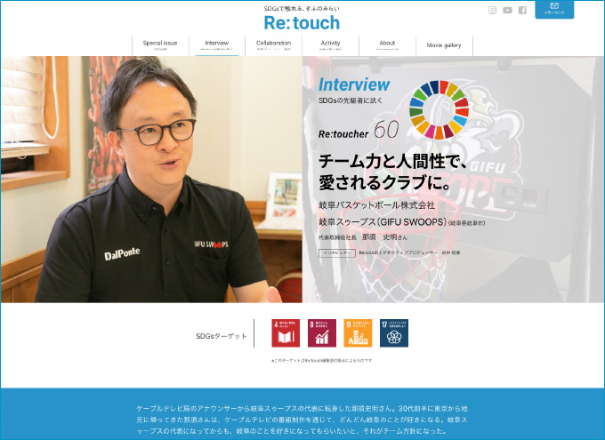 当社関連会社である株式会社Sincが企画・運営する「GIFU SDGs PORTAL SITE Re:touch [リ:タッチ]」にて、岐阜バスケットボール株式会社(岐阜スゥープス)代表取締役社長 那須史明氏とRe:touchエグゼクティブプロデューサー 田中信康(当社代表取締役社長)との対談記事を公開しております。岐阜スゥープスの「地元・岐阜」に対する熱い想いをぜひご覧ください。